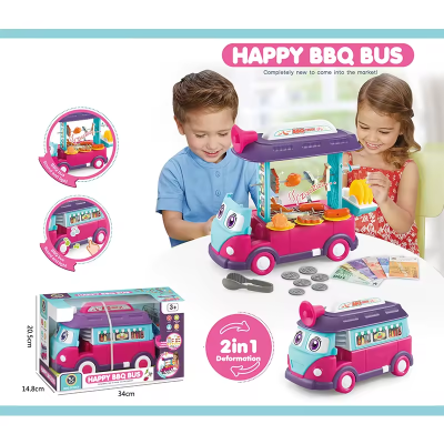 2-in-1 Deformation Cartoon Dessert Bus Toy Plastic Music Light Bbq Barbecue Toy Set Pretend Play Preschool Kitchen Toys for Kids